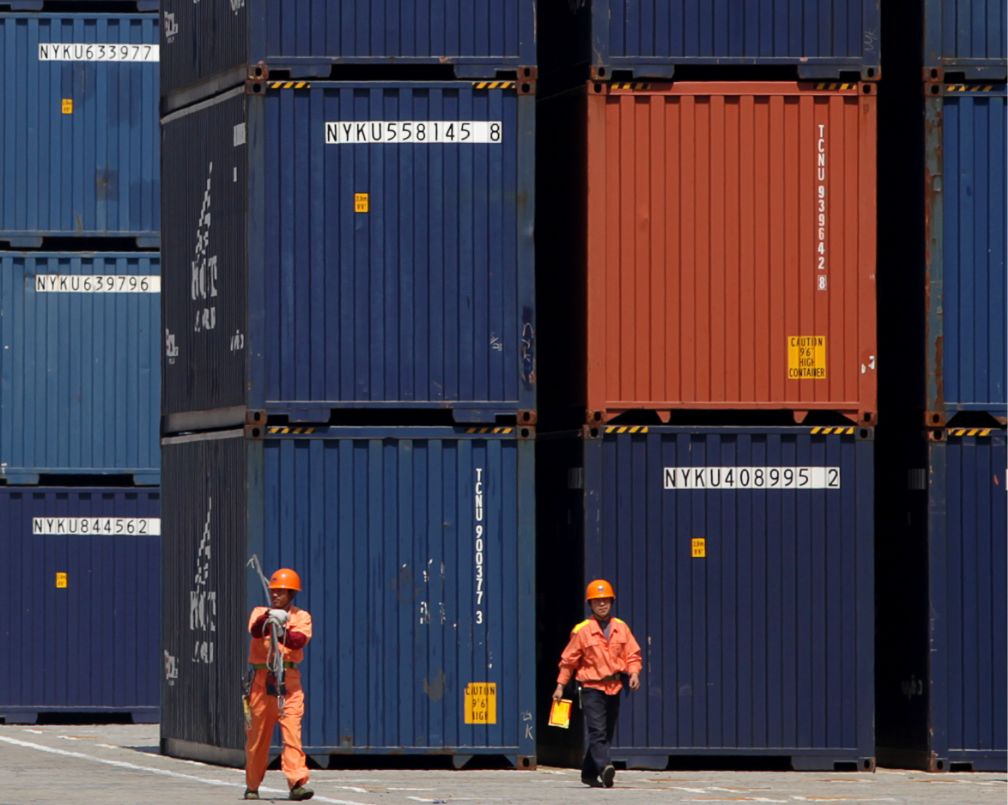 很簡單,一般來說,緊密挨個兒的,是空箱;留縫兒堆放的,是重箱。